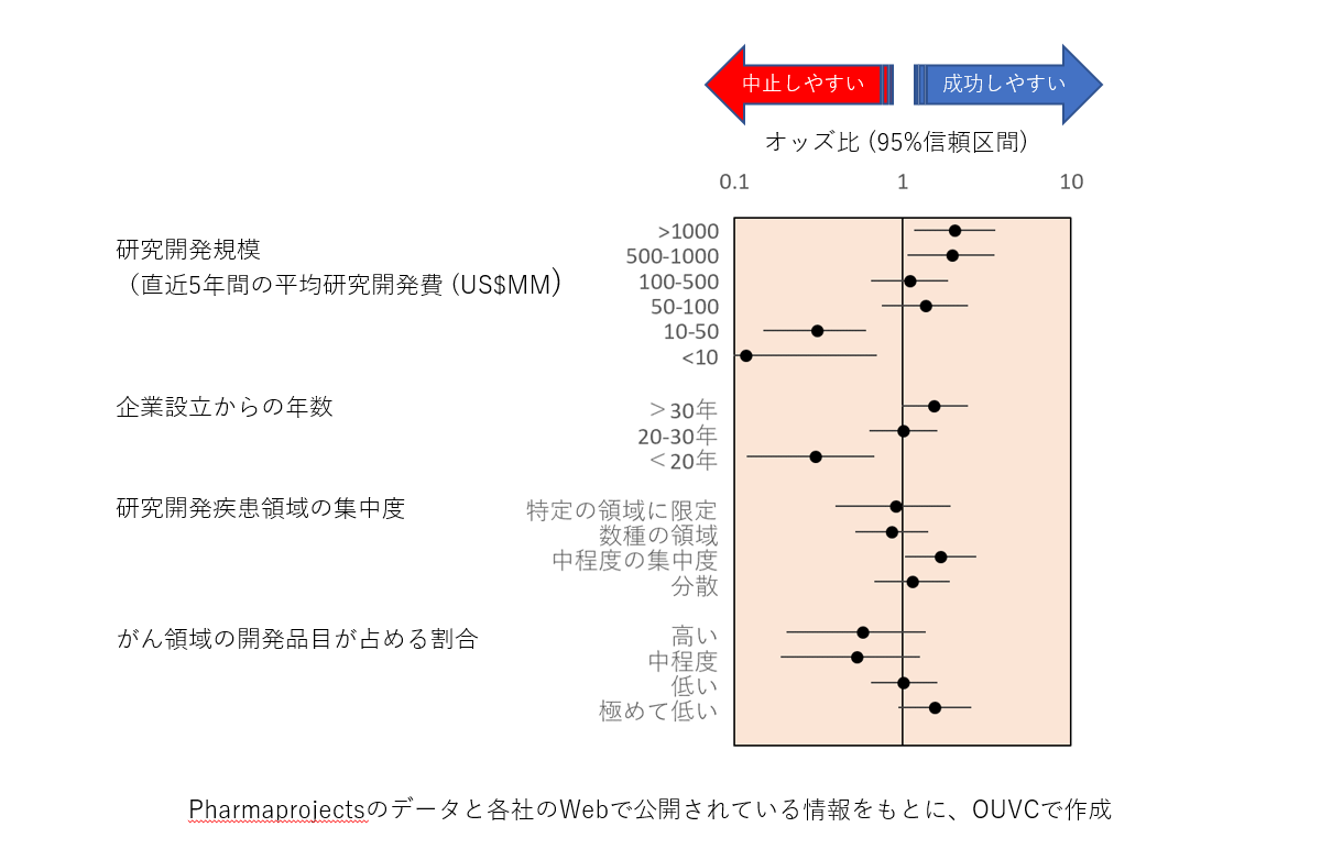 企業特性は、研究開発費、企業設立からの年数、研究開発の疾患領域の絞り込み度(ハーフィンダール・ハーシュマン指数)、および、開発品目に占めるがん領域の割合とし、これらの指標が臨床試験の成否に及ぼす影響をオッズ比として求めたものが下の図。
