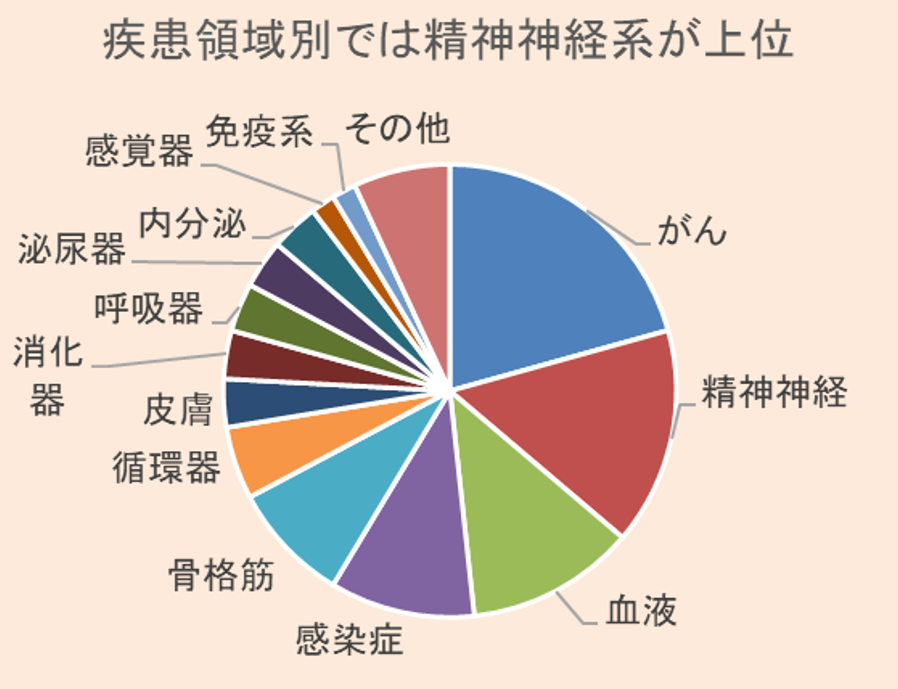 2019年に日米欧のいずれかで初めて承認された薬剤は58品目で、昨年より2品目少ない。疾患領域別に見ると、がんが最も多く、次いで精神神経系、血液疾患の順である(左下の図)。精神神経系治療薬が比較的多いことは2019年の特徴の一つである。モダリティでは低分子化合物が約60%を占める(右下の図)。モノクローナル抗体と抗体薬物複合体は、それぞれ4品目と3品目。新しい技術が着実に実用化されている。遺伝子治療なども含め、モダリティの種類が増えたことも特徴。