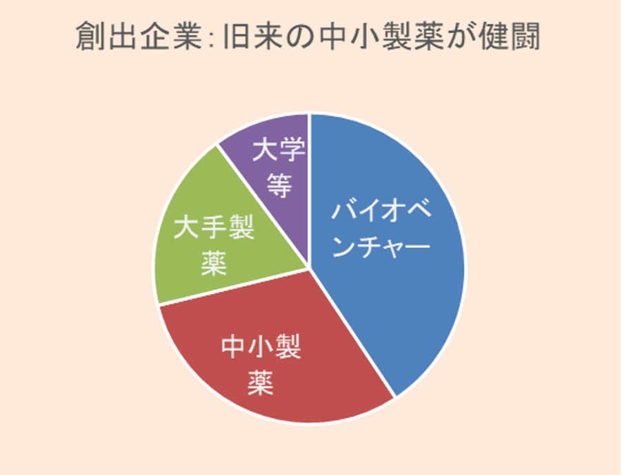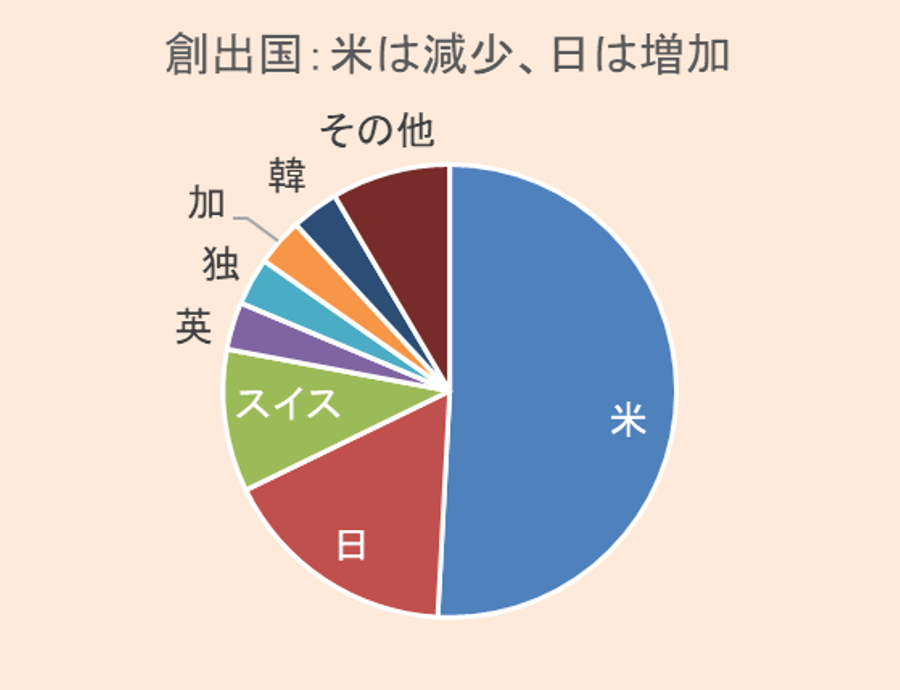 新薬のオリジンを見たものが左下の図。バイオベンチャーが起源となったものが最も多く、40%である。2018年は57%であったので、大幅な割合の減少である。一方で、中小製薬企業は31%となり、前年の13%から大きく伸びている。大手製薬企業は18%で、前年(22%)から多少の減少である。創出国別で見ると、米国は最も多くの新薬を生み出しているが、前年に比べると割合は大きく減少してる(右下の図)。逆に健闘しているのは日本である。